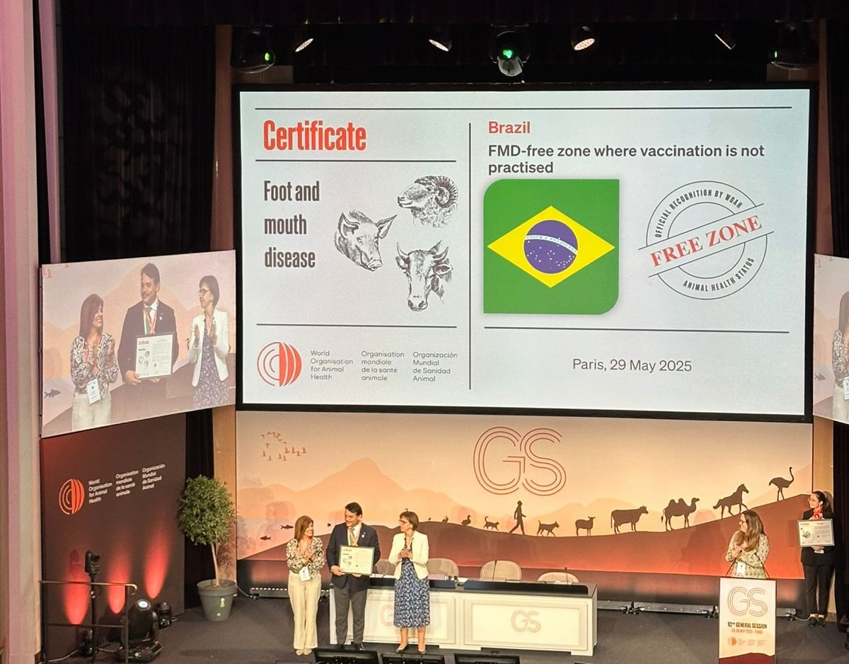 O Brasil recebeu durante a 92ª Sessão Geral da Assembleia Mundial da Organização Mundial de Saúde Animal (OMSA), em Paris, o certificado de país livre de febre aftosa sem vacinação.