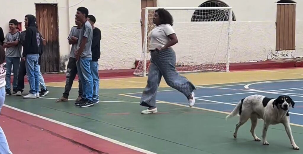 Dois rapazes simularam uma luta corporal no pátio ao lado das salas de aula, cercados por um grande tumulto de colegas que gritavam e incentivavam a confusão para atrair a atenção da gestão. O realismo foi tanto que uma funcionária da escola chegou a correr para o local na tentativa de apartar a situação antes mesmo da chegada da diretora.