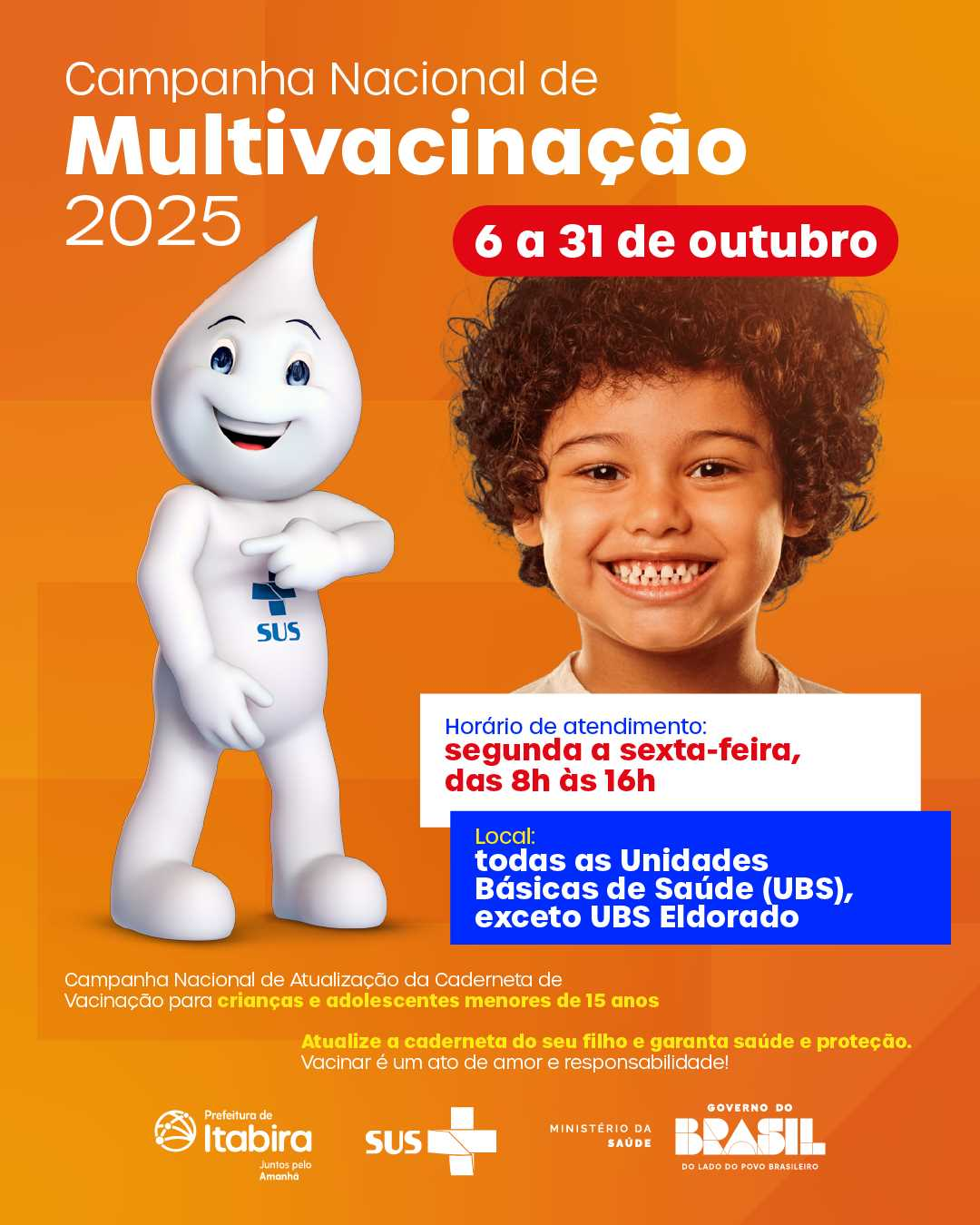 No dia 18 de outubro (sábado), Itabira participará do Dia D de Multivacinação com atendimento nas unidades de saúde. A mobilização tem como objetivo ampliar o acesso e garantir a vacinação de todas as crianças e adolescentes que não conseguirem comparecer durante a semana.