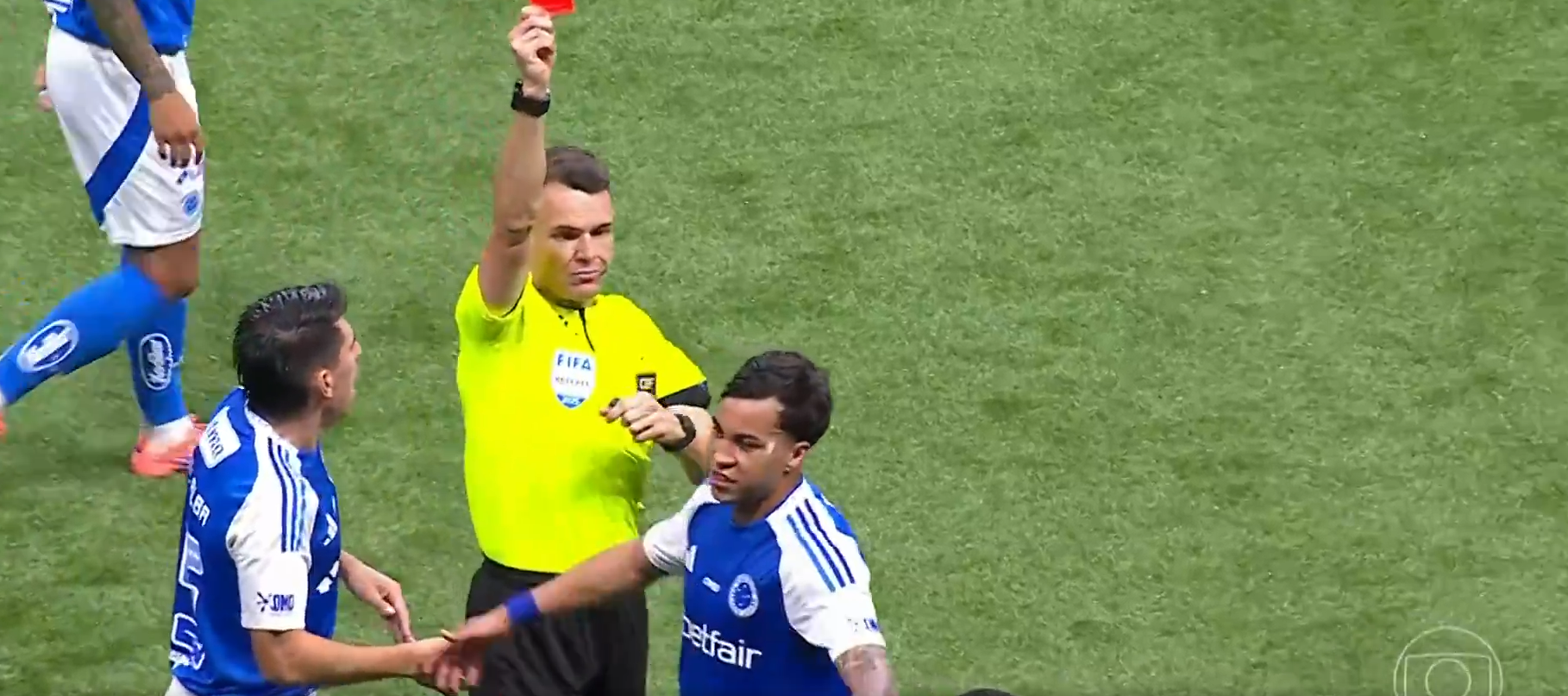 A expulsão de Kaio Jorge, citada por Lucas, aconteceu imediatamente após o gol. Os jogadores do Cruzeiro se dirigiram ao árbitro Paulo César Zanovelli, reclamando também do escanteio marcado. O VAR avisou ao dono do apito sobre o gesto de roubo feito pelo atacante, que levou vermelho direto.