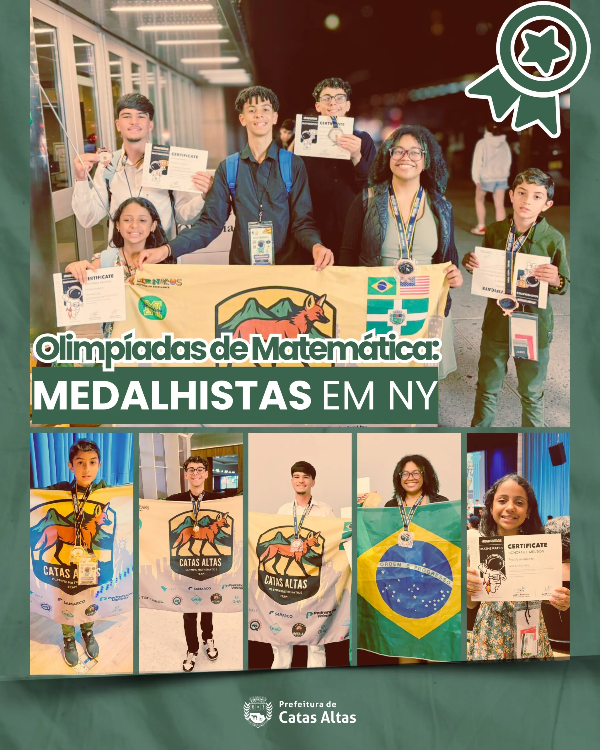 Os alunos de Catas Altas voltaram dos Estados Unidos com um resultado histórico: foram quatro medalhas e uma menção honrosa nas Olimpíadas de Matemática, realizadas em Nova York. O estudante Erickson conquistou a tão sonhada medalha de ouro, enquanto Antônio, Luiz Fernando e Mara garantiram medalhas de bronze, e a aluna Lara Queiroz recebeu uma Honra ao Mérito pela excelente participação.
