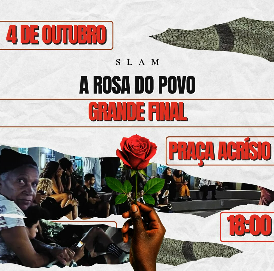 O coletivo A Rosa do Povo realizará, neste sabádo, a final do slam poético aberta ao público, Na Praça Dr. Acrisío de Alvarenga. O evento começa às 18h e pretende reunir poetas, artistas e moradores em uma celebração da palavra e da resistência.