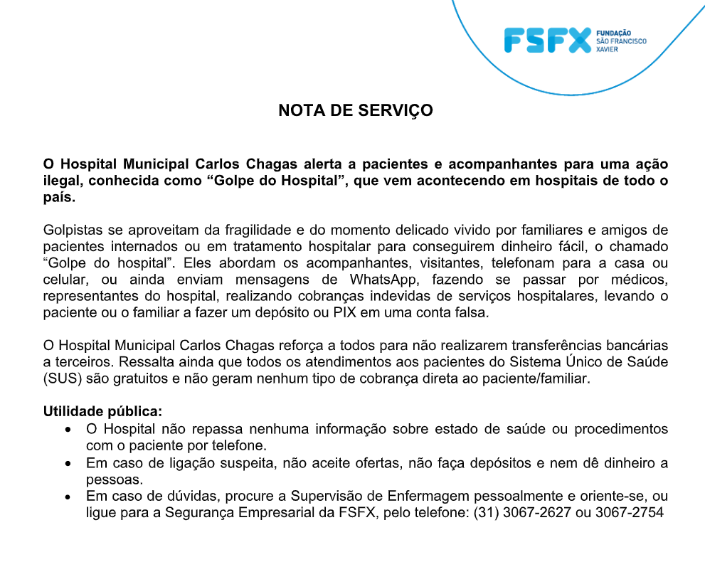 O Hospital Municipal Carlos Chagas emitiu um alerta importante à comunidade sobre uma prática criminosa que vem sendo registrada em diversas regiões do país: o chamado “Golpe do Hospital”.