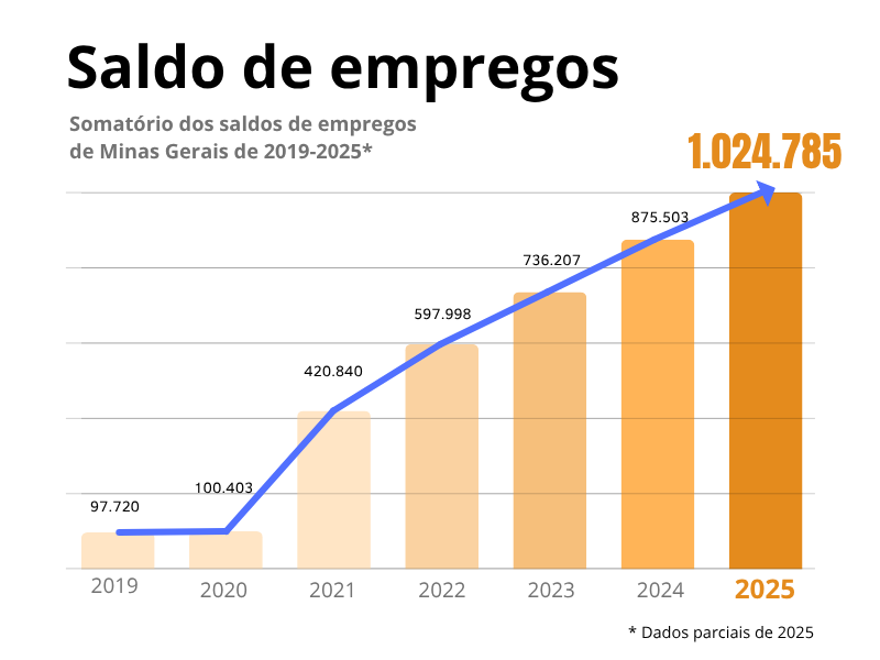 Desde 2021, Minas aparece entre os três estados com a maior geração de vagas no Brasil. Considerando o período pós-pandemia, ou seja, a partir de maio de 2023, Minas é o segundo estado que mais gerou empregos, com acumulado de mais de 400 mil vagas, atrás apenas de São Paulo, com 1,185 milhão.