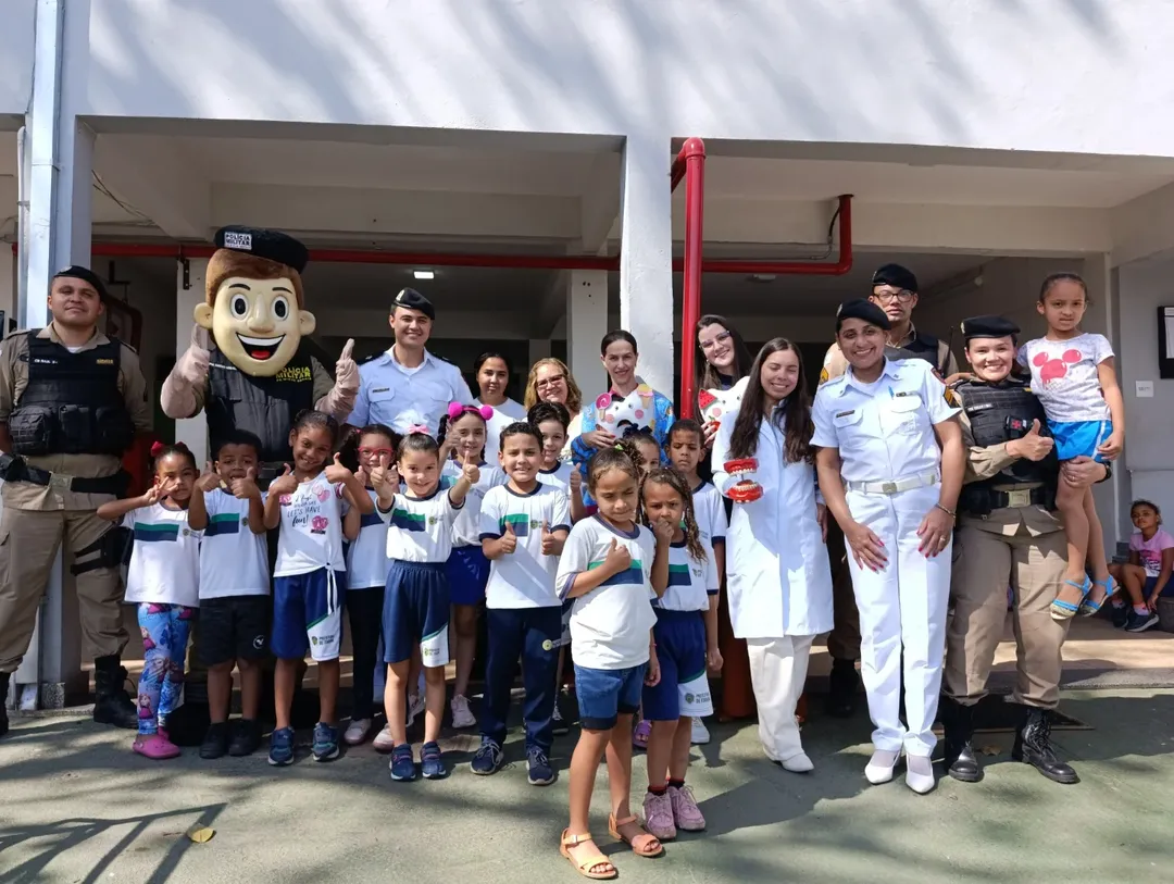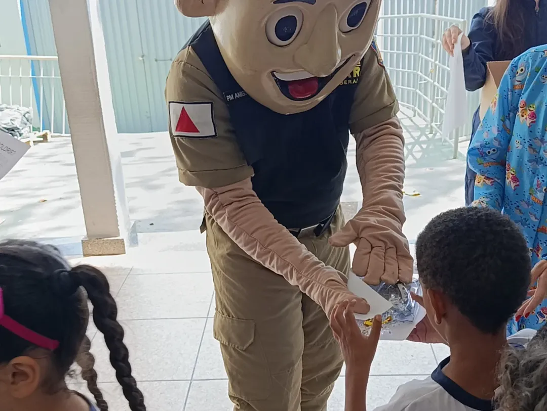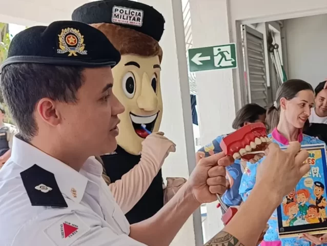 Ele ainda orientou os professores e a equipe da escola, realizando atividades com modelos de bocas em tamanho grande (macromodelos) e utilizando materiais lúdicos, jogos educativos e desenhos para as crianças colorirem. Todos os estudantes levaram para casa um kit de higiene individual. O mascote PM Amigo Legal também participou da ação, levando alegria às crianças, que o abraçaram e demonstraram carinho.